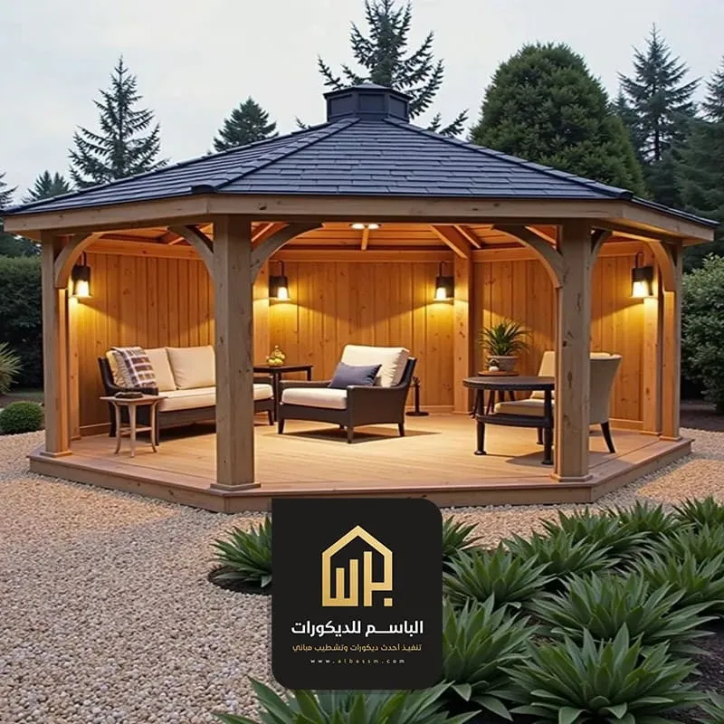 برجولات خشب مع إضاءة في القطيف: أجواء ساحرة ليلًا